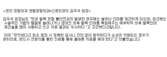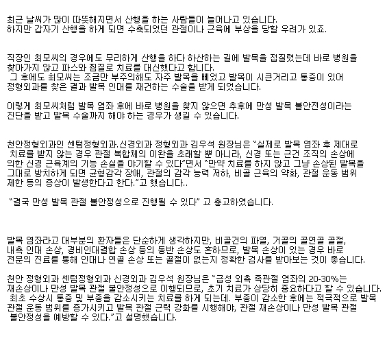 <천안>발목 염좌, 방치하면 수술해야 할 수도 페이지 정보 작성자 센텀 작성일14-04-30 11:02 조회25,973회 댓글0건 관련링크 이전글 목록 본문 원문보기 : http://news.heraldcorp.com/view.php?ud=20140331001007&md=20140403005547_BK 댓글목록 등록된 댓글이 없습니다. 이전글 목록